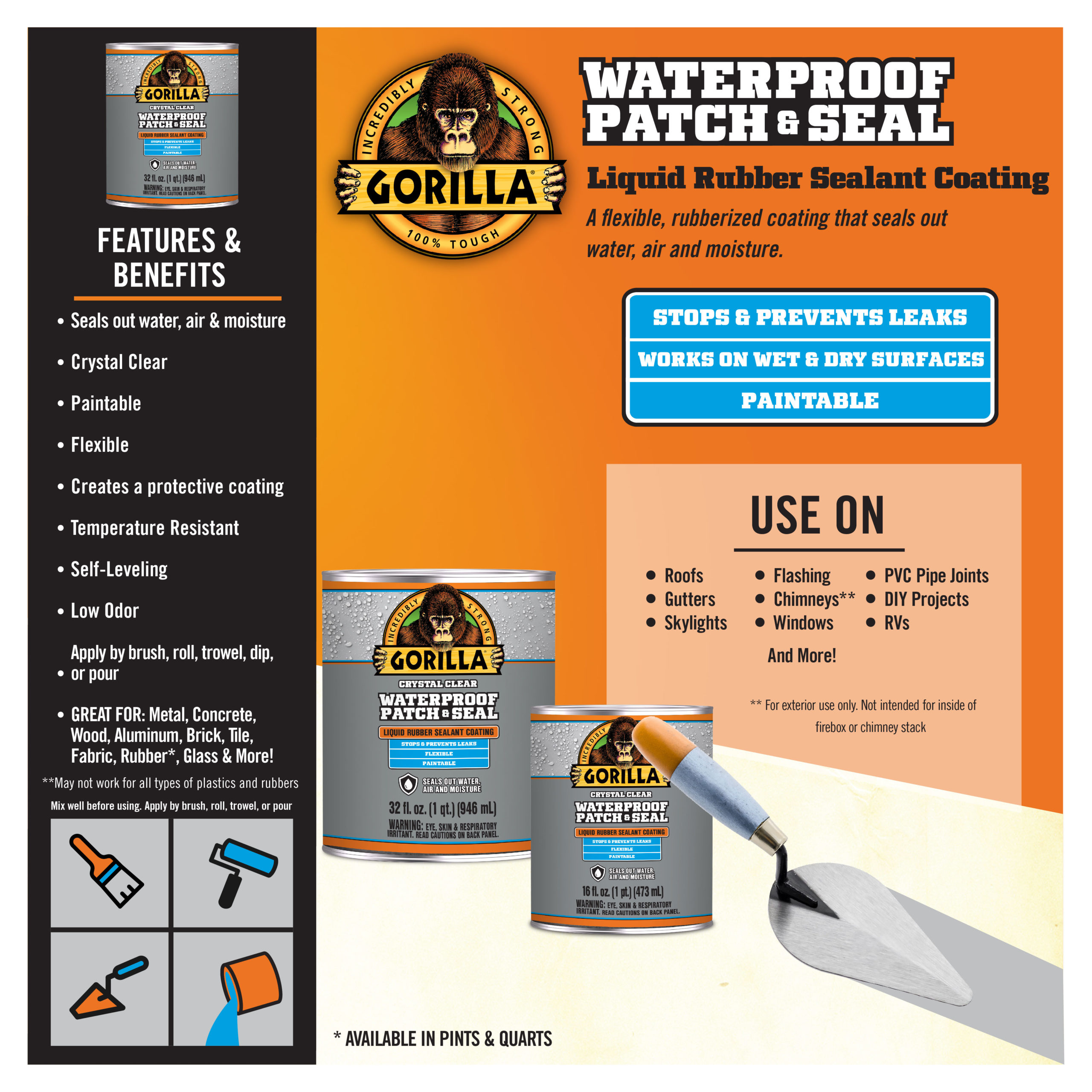 - Gorilla Waterproof Patch & Seal Liquid is designed to seal out water, air and moisture. Surfaces for use include roofs, gutters, skylights, flashing, chimneys*, PVC pipe joints, windows, RVs and other DIY Projects. *Please note, this product is not intended for inside of firebox or chimney stack. It may not work for all types of plastics or rubbers.